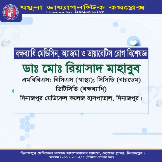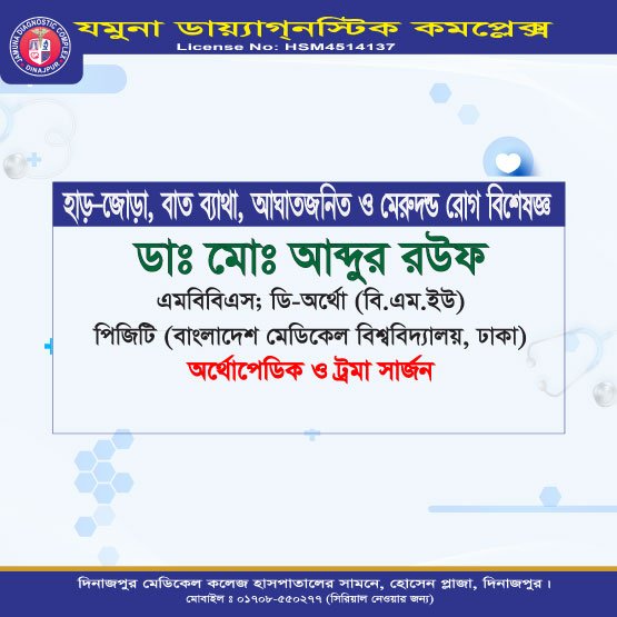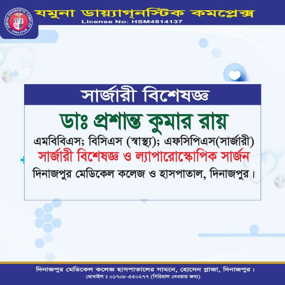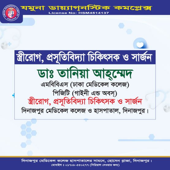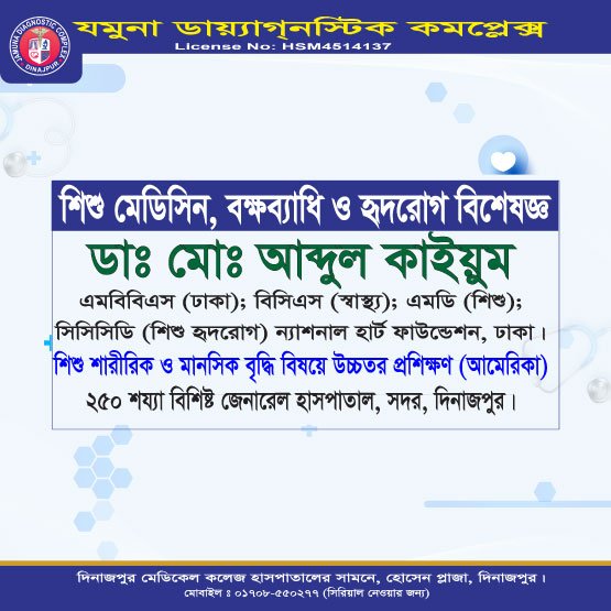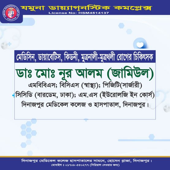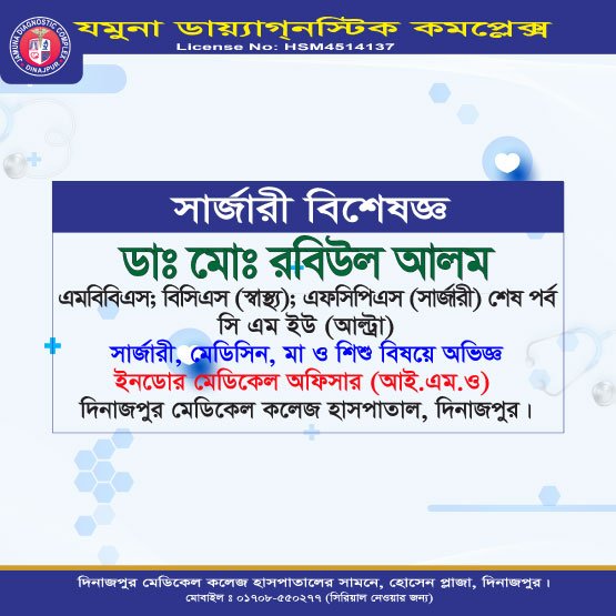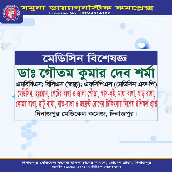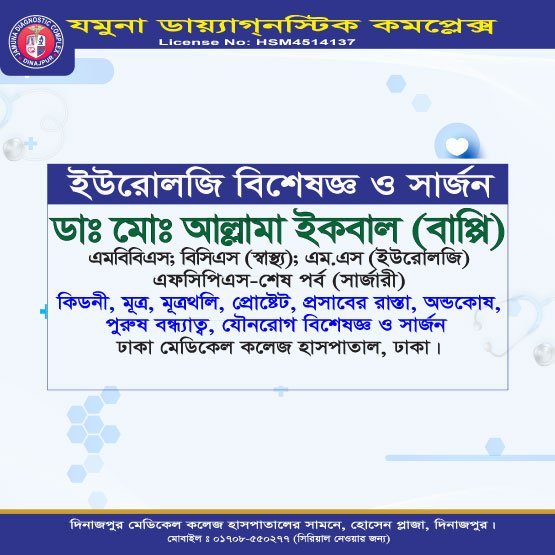 দিনাজপুরের অন্যতম আধুনিক ও উন্নত চিকিৎসা প্রতিষ্ঠান যমুনা ডায়াগনস্টিক কমপ্লেক্স রোগীদের জন্য সর্বোচ্চ মানের সেবা প্রদানে প্রতিশ্রুতিবদ্ধ। এখানে অভিজ্ঞ ও দক্ষ বিশেষজ্ঞ ডাক্তারদের সমন্বয়ে রোগ নির্ণয়, পরামর্শ ও চিকিৎসা প্রদান করা হয়।