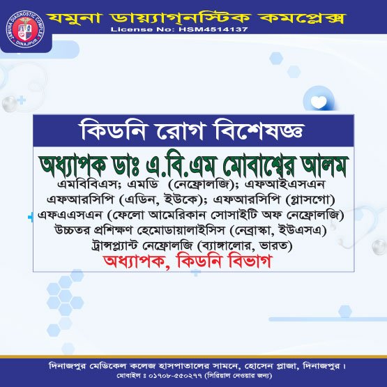 • কিডনি রোগ বিশেষজ্ঞ – অধ্যাপক ডা. এ.বি.এম. মোবাশ্বের আলম